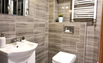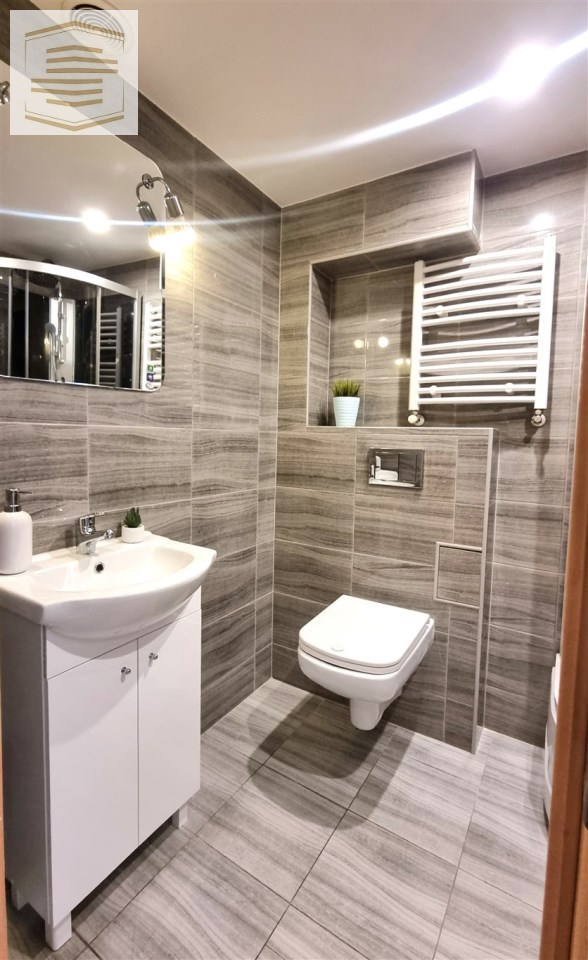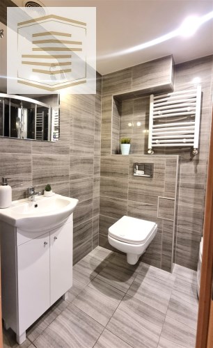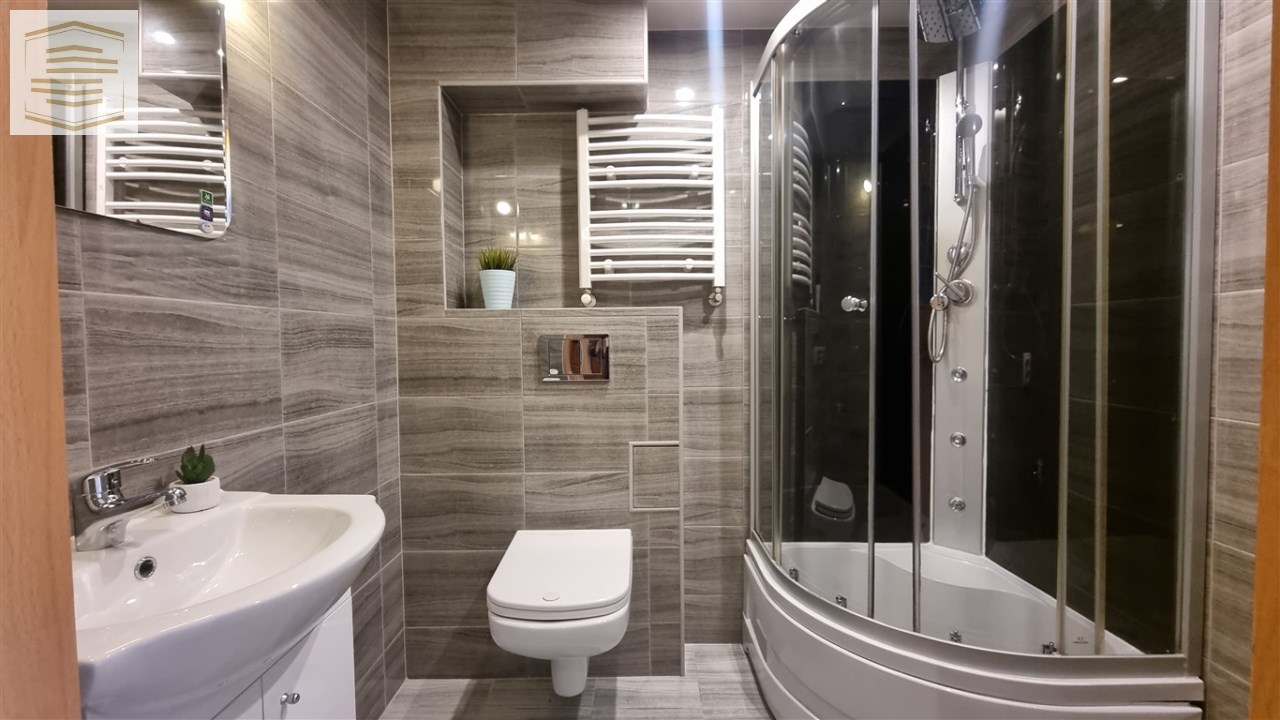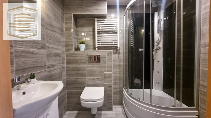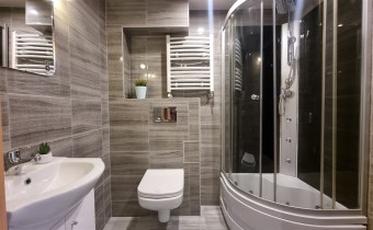 Na ścianach gładzie gipsowe - kuchnia, tapety - pokoje, panele ścienne - przedpokój. Łazienka z wc cała w kaflach, na wyposażeniu kabina prysznicowa.