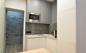 Nowoczesna ślepa kuchnia otwarta na salon, od którego oddzielona jest dużą wyspą z hokerami, posiada sporych rozmiarów zabudowę z licznymi szafkami i szufladami, na wyposażeniu ze sprzętami AGD tj. lodówka, zmywarka, designerski okap sufitowy, mikrofalówka pod zabudowę.