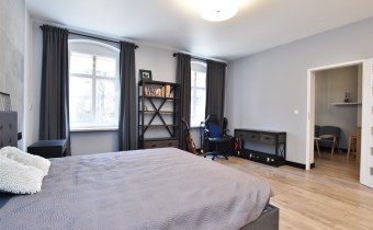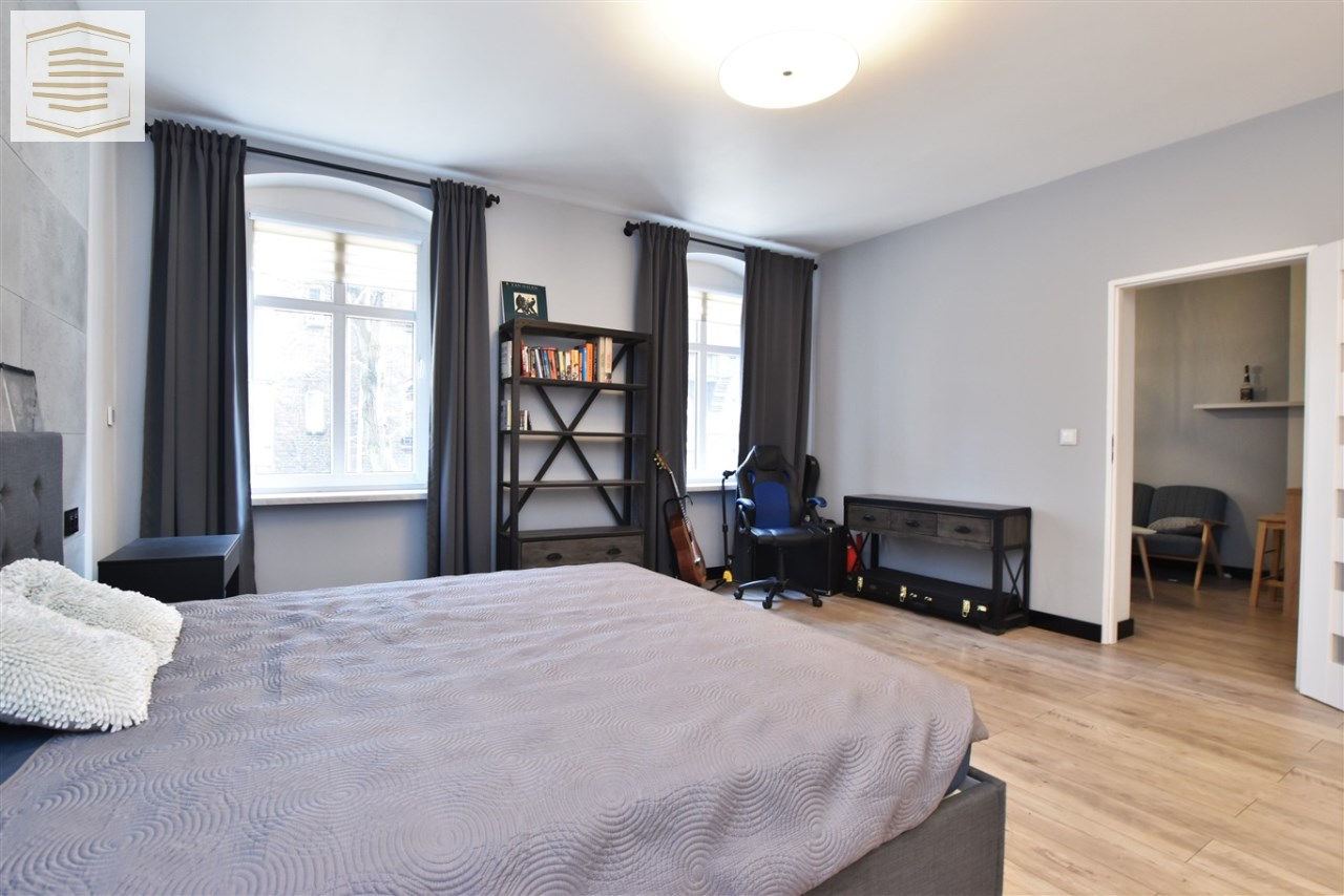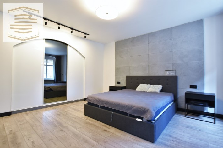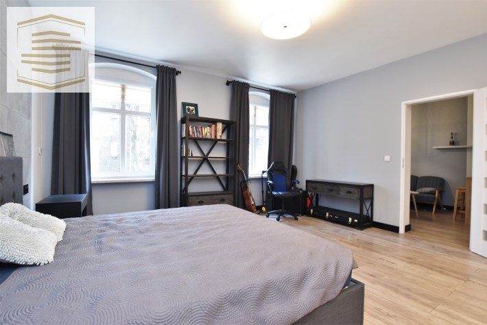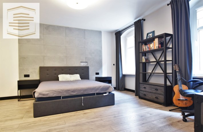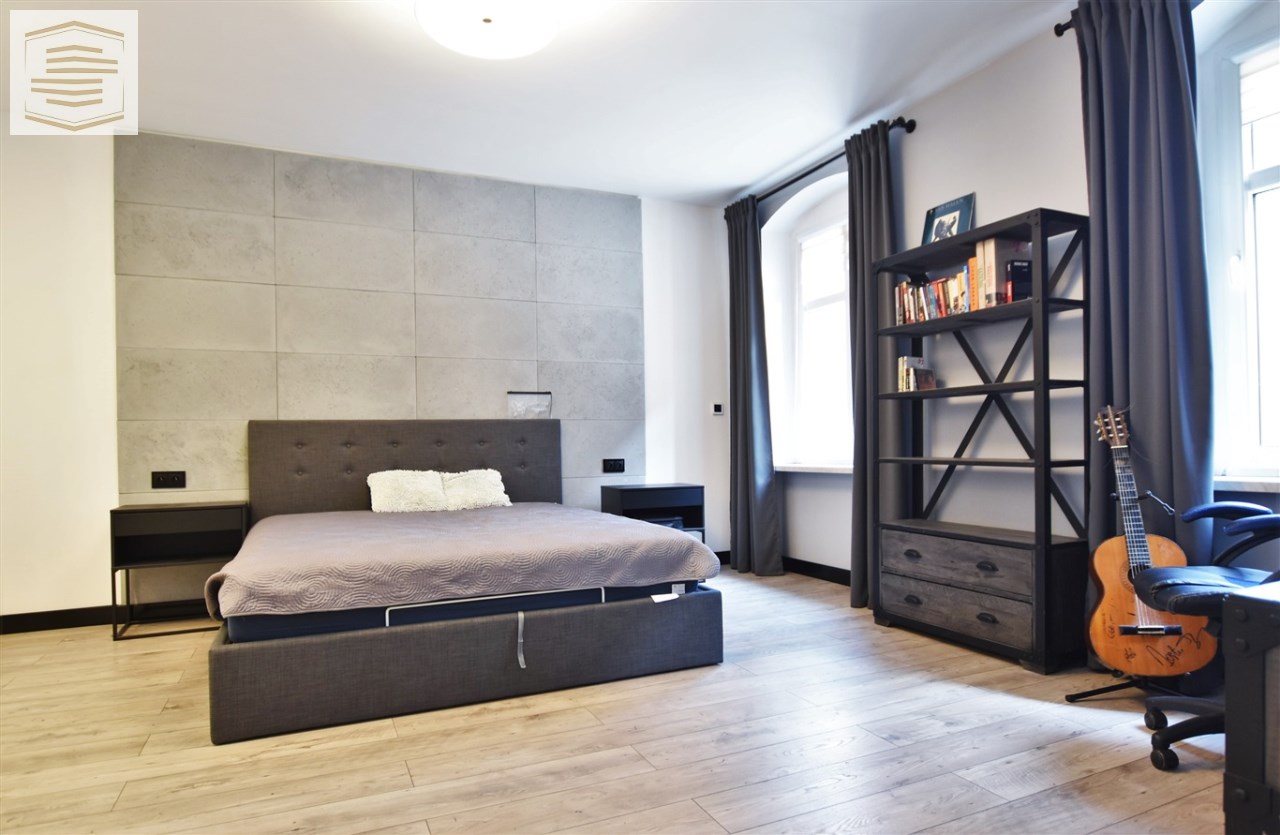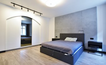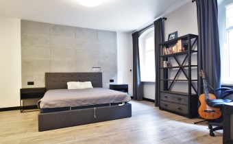 Atutem mieszkania jest spora sypialnia z dużym łóżkiem małżeńskim o wymiarach 180x200 cm oraz pojemną szafą szafą przesuwną na całej ścianie o długości 4m. Na ścianie za łóżkiem położone płyty betonowe które nadają jej wyjątkowego charakteru.