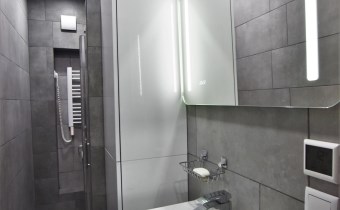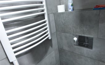 Łazienka cała w betonowych gresach, posiada wnękę prysznicową z odpływem liniowym.