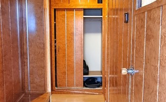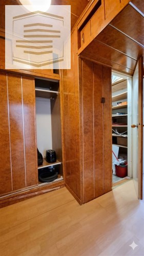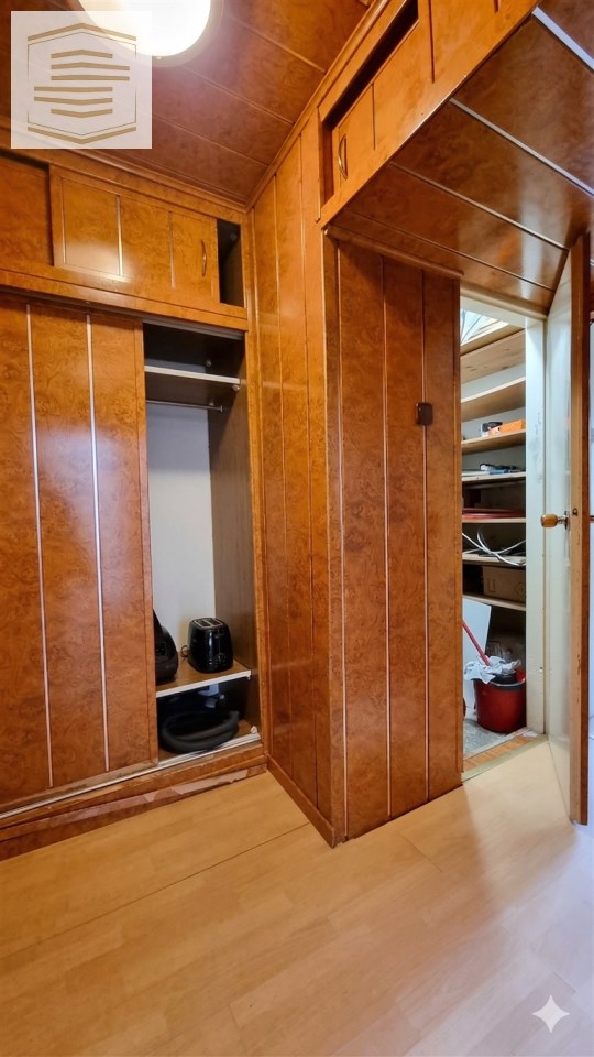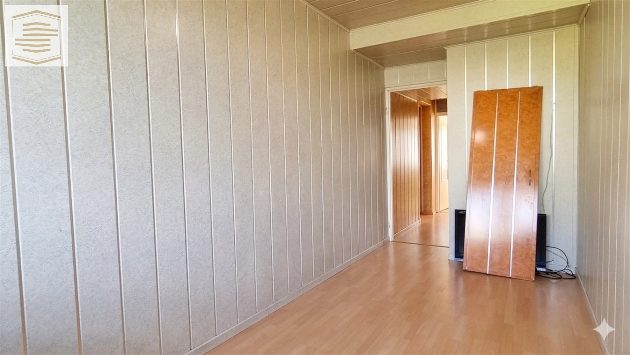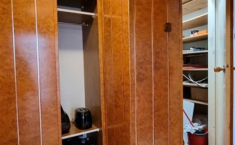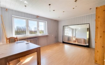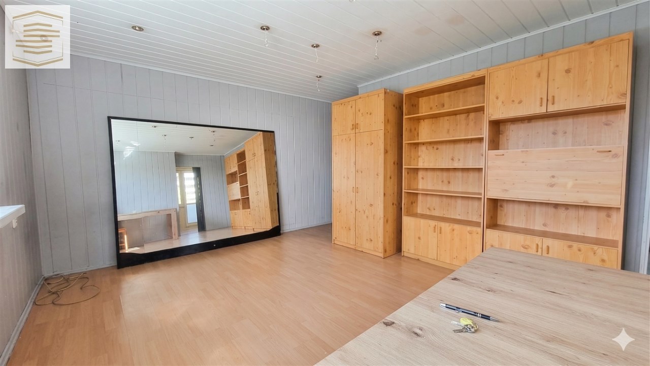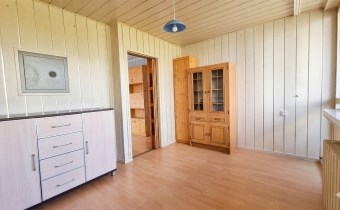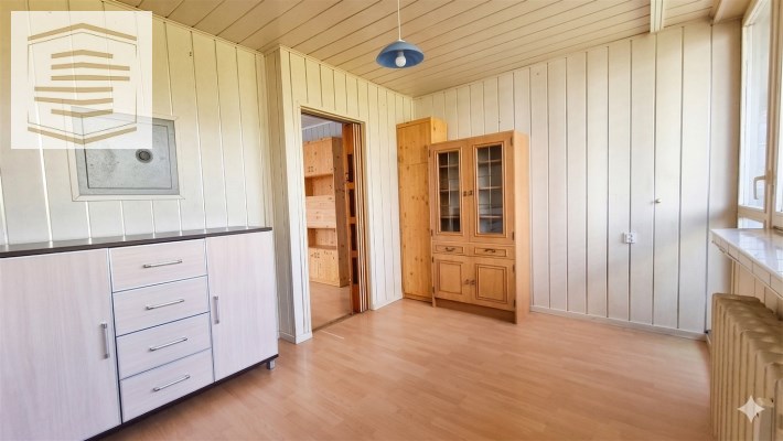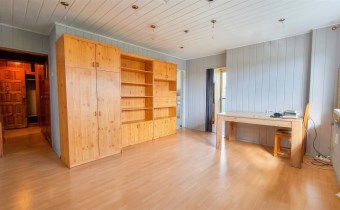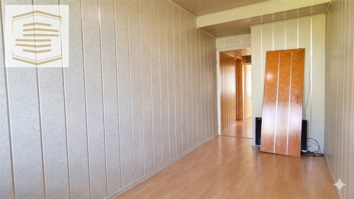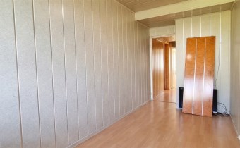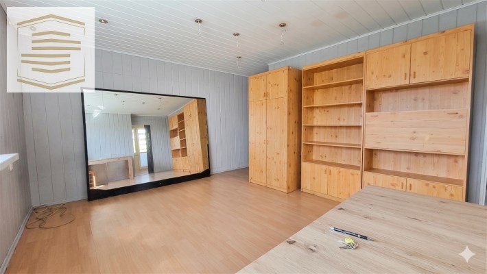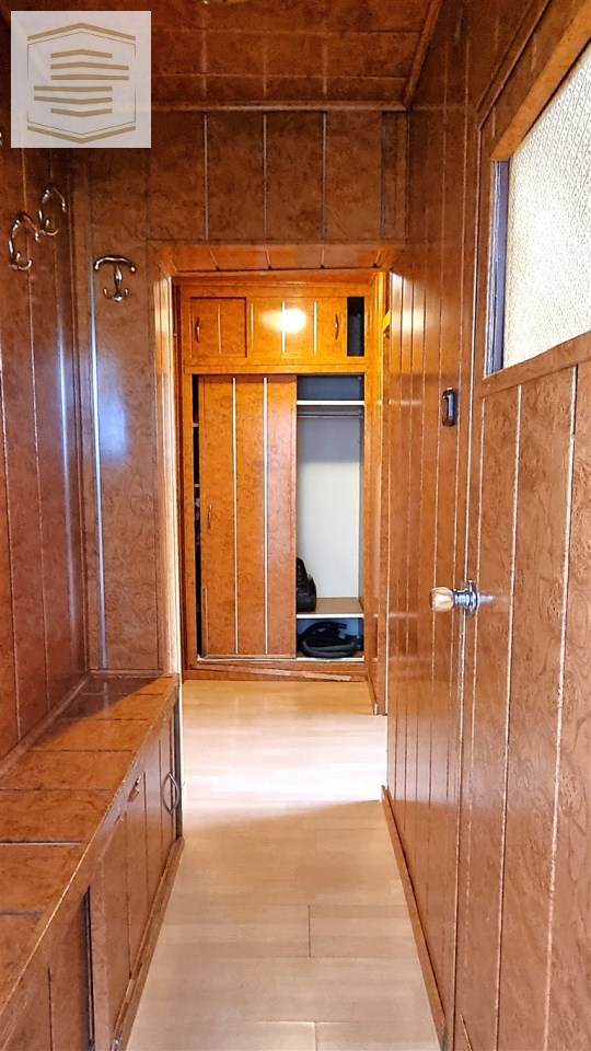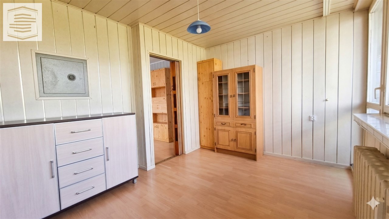 Na podłogach panele i kafle, na ścianach panele pcv i boazeria. Łazienka razem z wc, w kaflach.