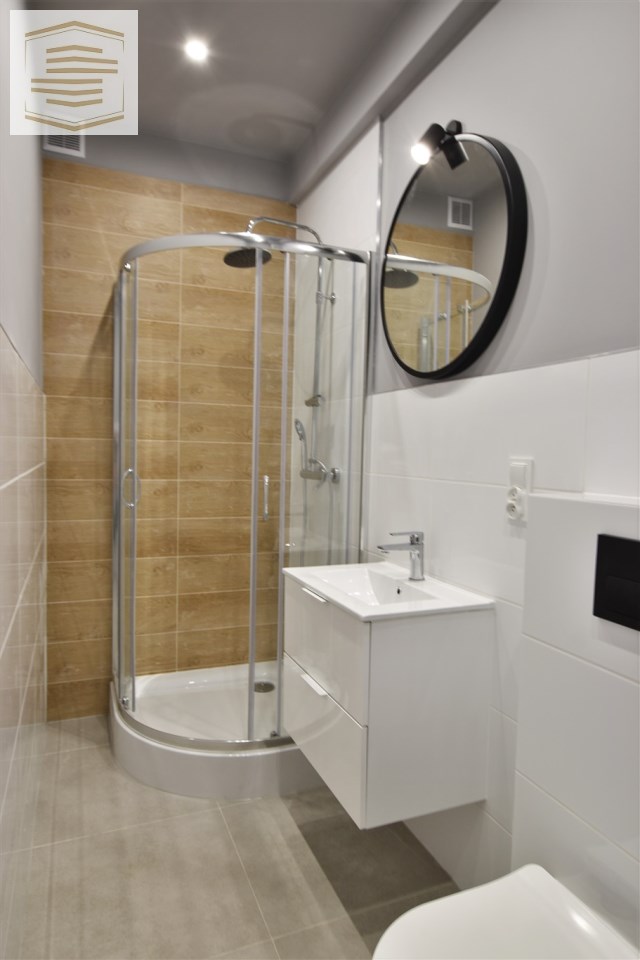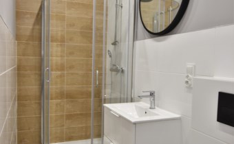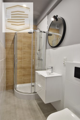 Łazienka cała w nowoczesnych kaflach, na wyposażeniu z dużą kabiną prysznicową, pojemną elegancką szafką umywalkową.