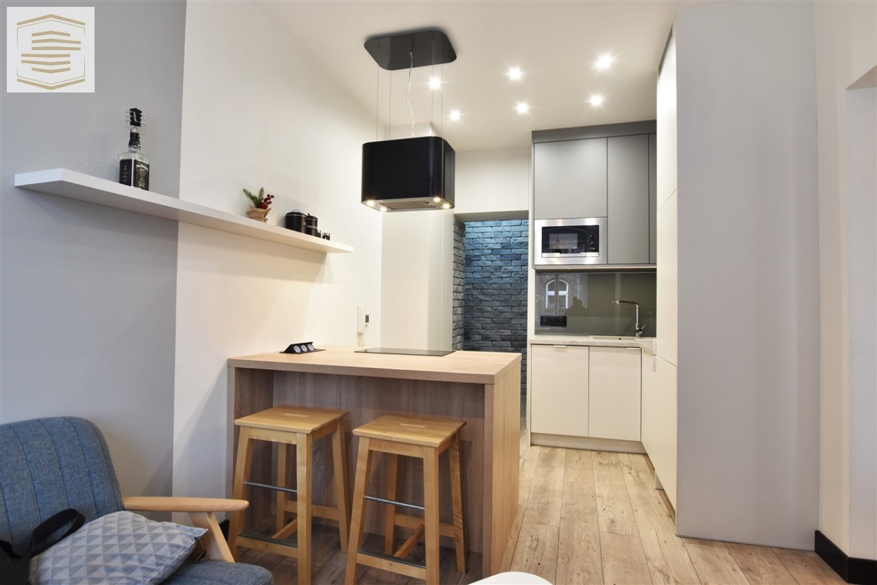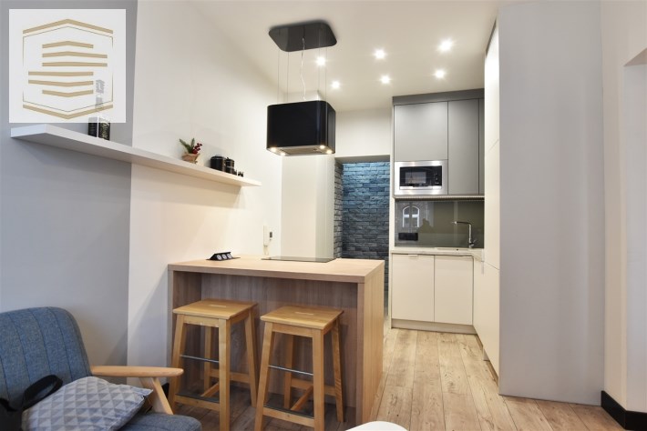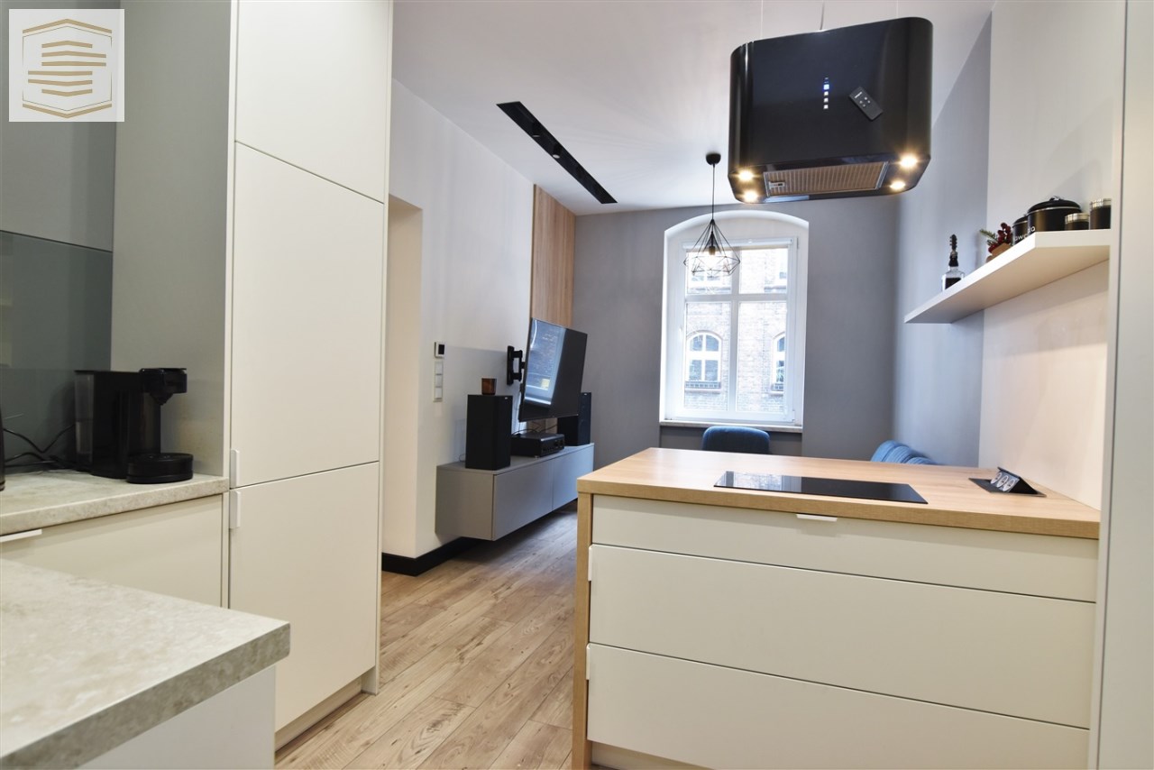Nowoczesna ślepa kuchnia otwarta na salon, od którego oddzielona jest dużą wyspą z hokerami, posiada sporych rozmiarów zabudowę z licznymi szafkami i szufladami, na wyposażeniu ze sprzętami AGD tj. lodówka, zmywarka, designerski okap sufitowy, mikrofalówka pod zabudowę.