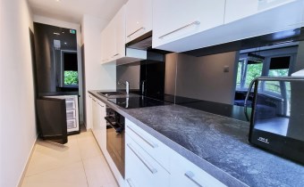 - Kuchnia: nowoczesna zabudowa kuchenna z lakierowanymi frontami. Na wyposażeniu: lodówko-zamrażarka Samsung, piekarnik, płyta indukcyjna, okap.