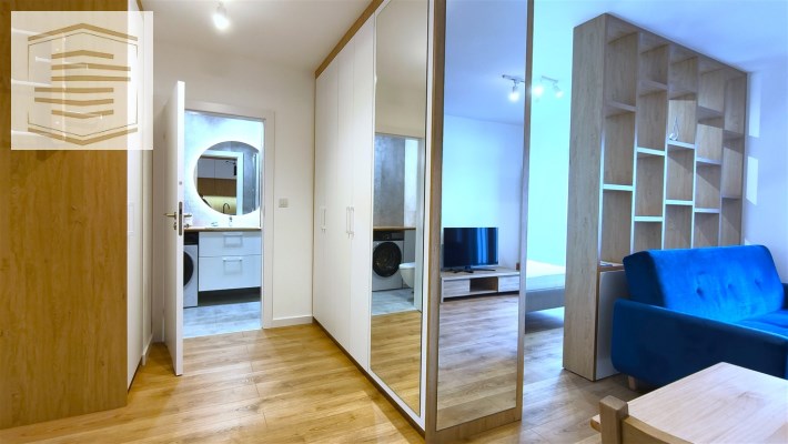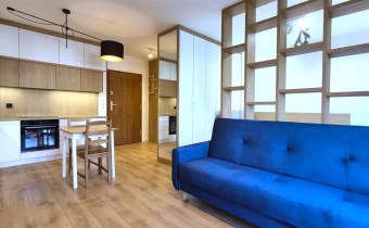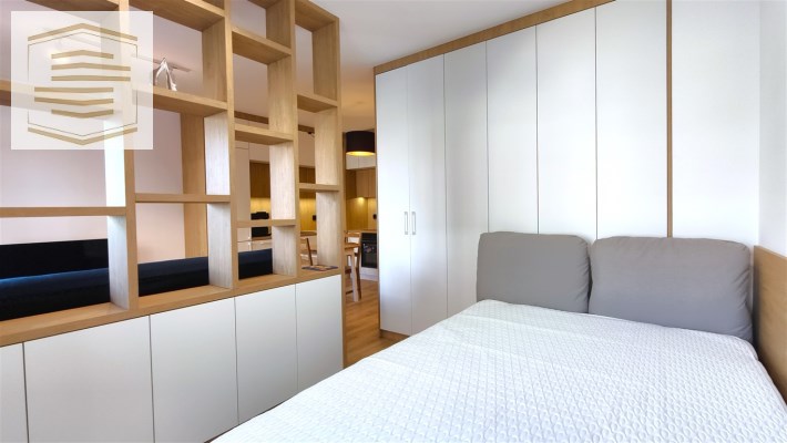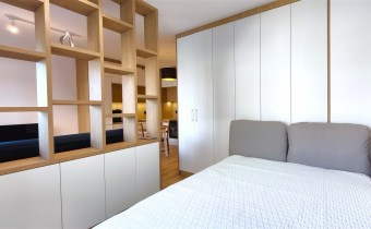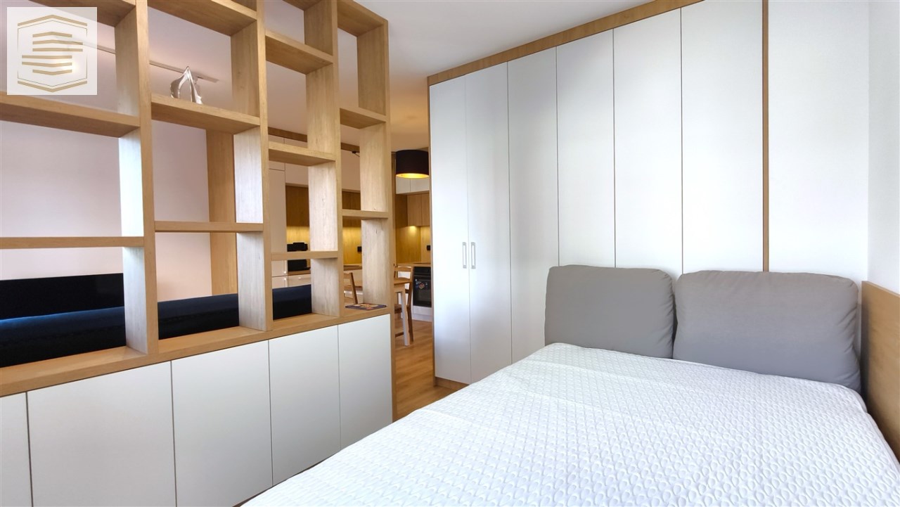 Mieszkanie zostało urządzone tak, aby maksymalnie wykorzystać jego przestrzeń i posiada bardzo dużo szaf i miejsc do przechowywania. Pomimo tego iż jest to kawalerka, to jest w niej wystarczająco dużo przestrzeni do mieszkania dwóch osób.