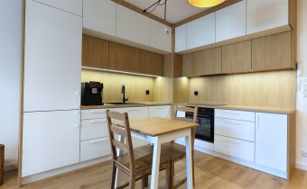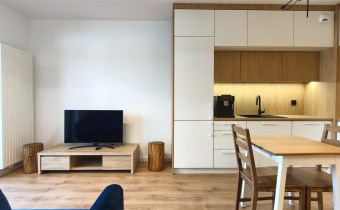- Kuchnia pod zabudową na wyposażeniu ze sprzętami AGD: lodówko-zamrażarka, zmywarka, piekarnik, okap, płyta indukcyjna, ekspress do kawy.