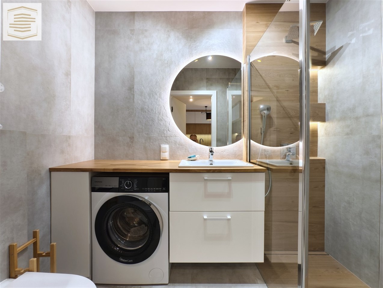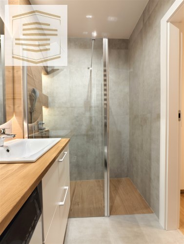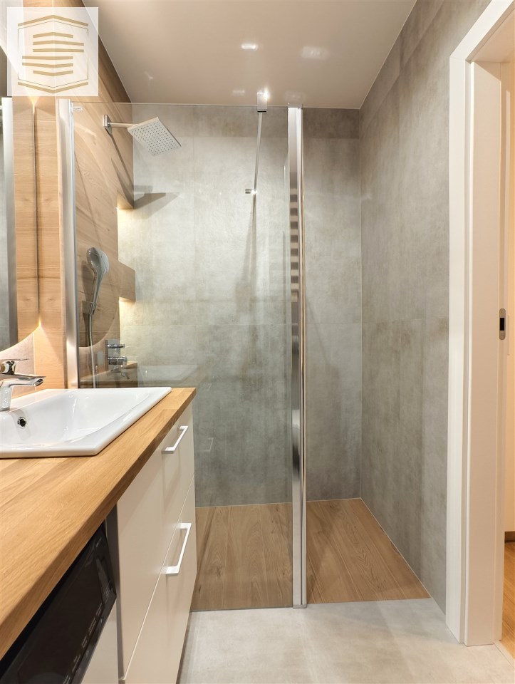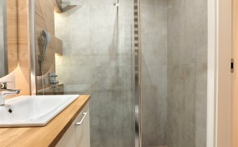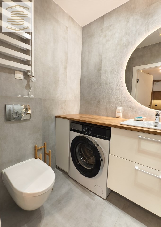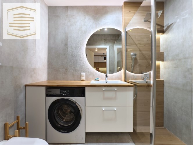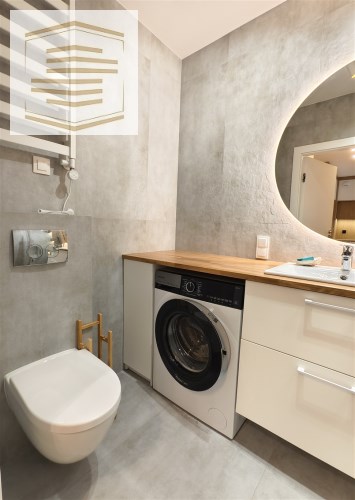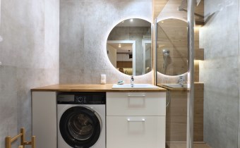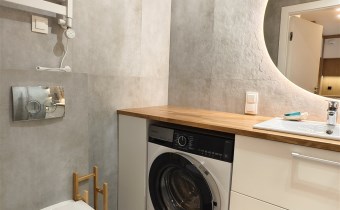 - Przestronna łazienka razem z wc, z przestronnym bezbrodzikowym prysznicem typu walk-in. Na wyposażeniu łazienki pralka, szafka umywalkowa i duże lustro z podświetleniem led.