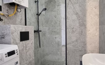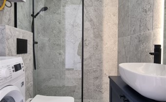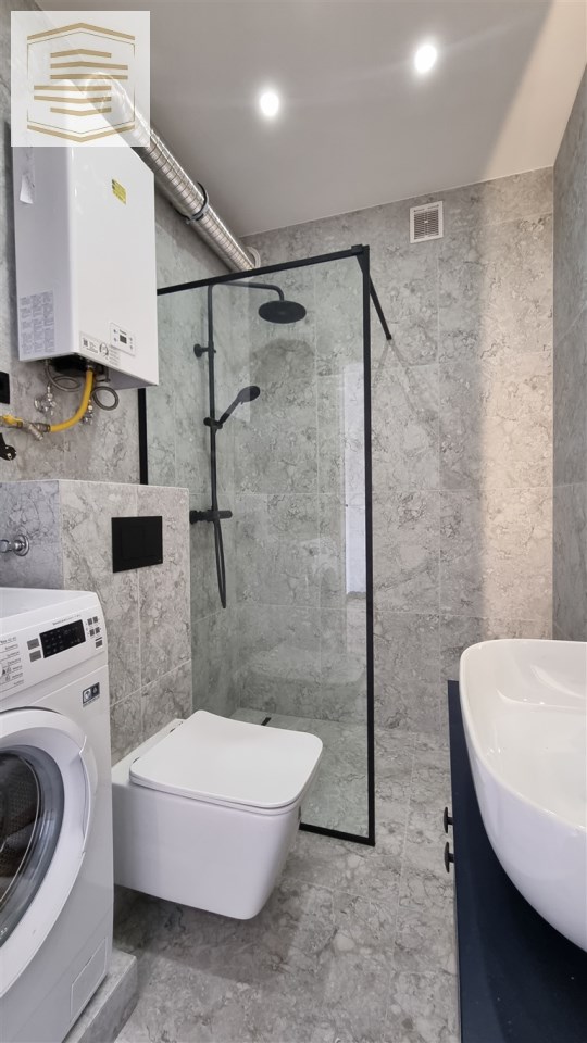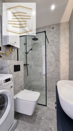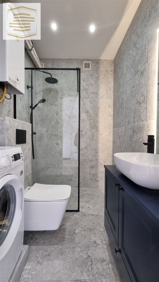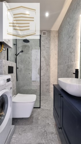 • Piękna łazienka z wc cała w nowoczesnych kamiennych gresach, na wyposażeniu z kabina prysznicową typu walk-in, stylowa szafka umywalkowa, pralka, lustro led i nowy piecyk gazowy